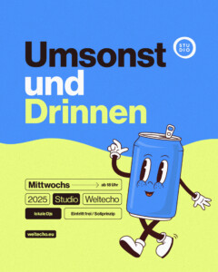 Umsonst & Drinnen – DJs & gute Drinks in gemütlicher Atmosphäre im Weltecho Studio. Eintritt frei.